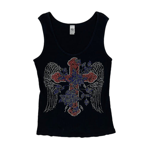 Women's Rhinestone Winged Cross Ribbed Tank Top - Size M