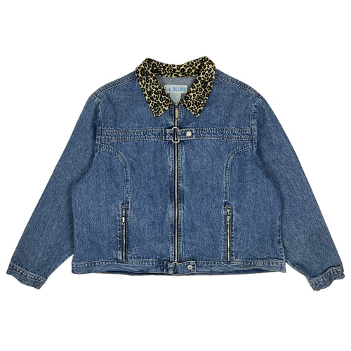 Women's Faux Leopard Collar Denim Jacket - Size XL