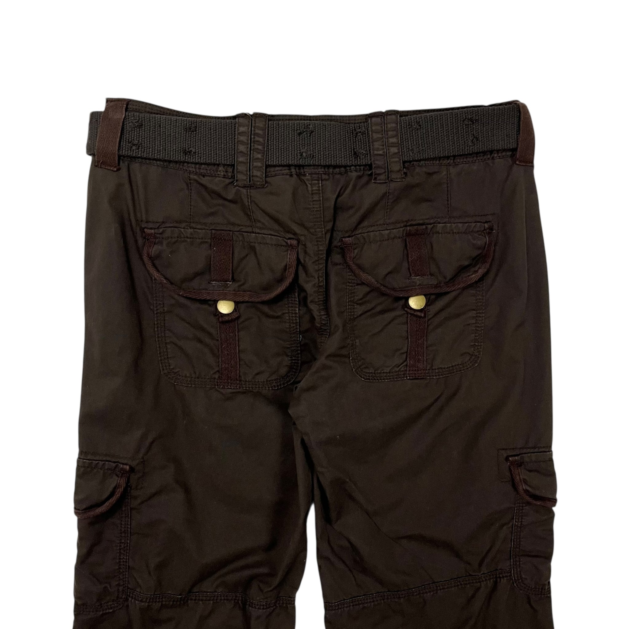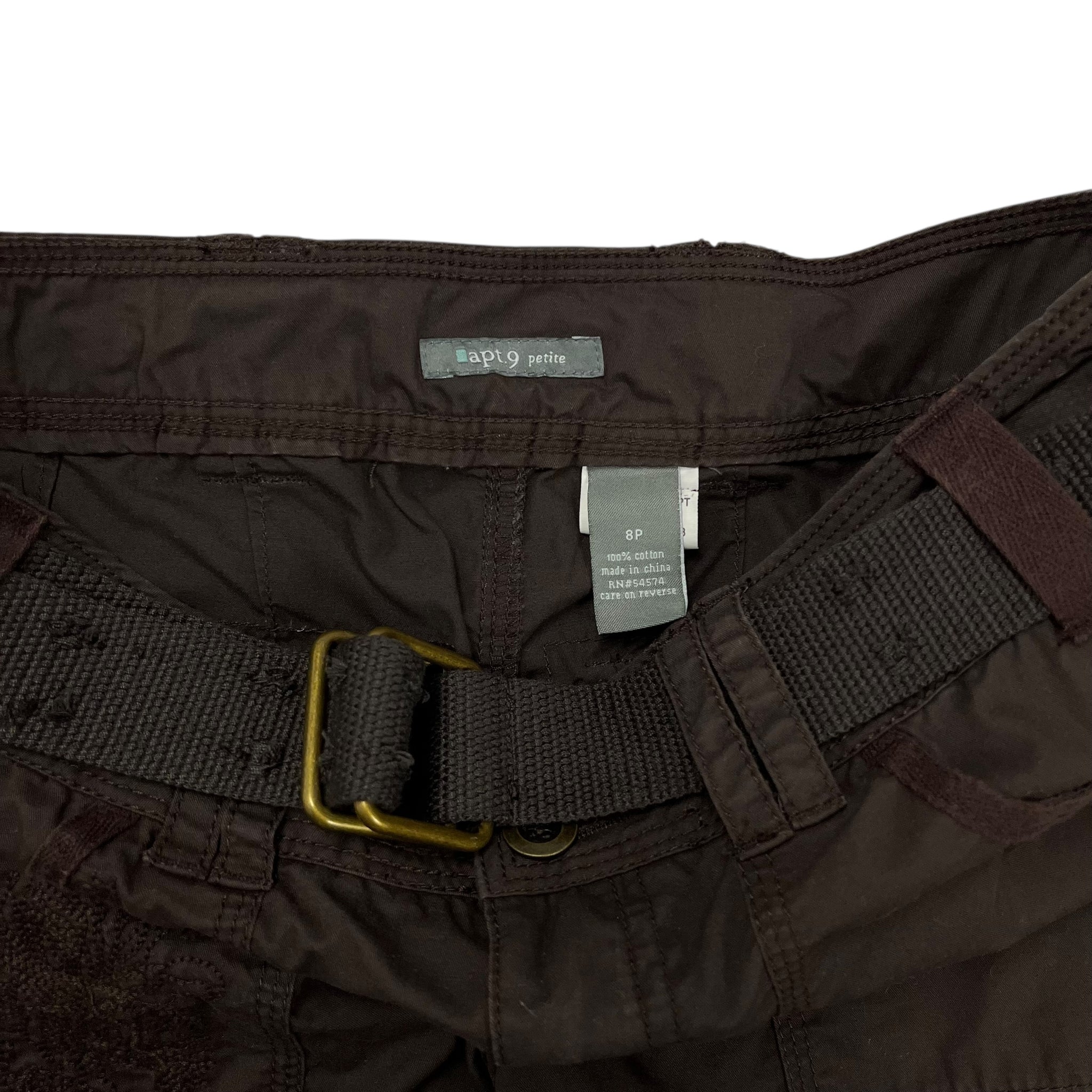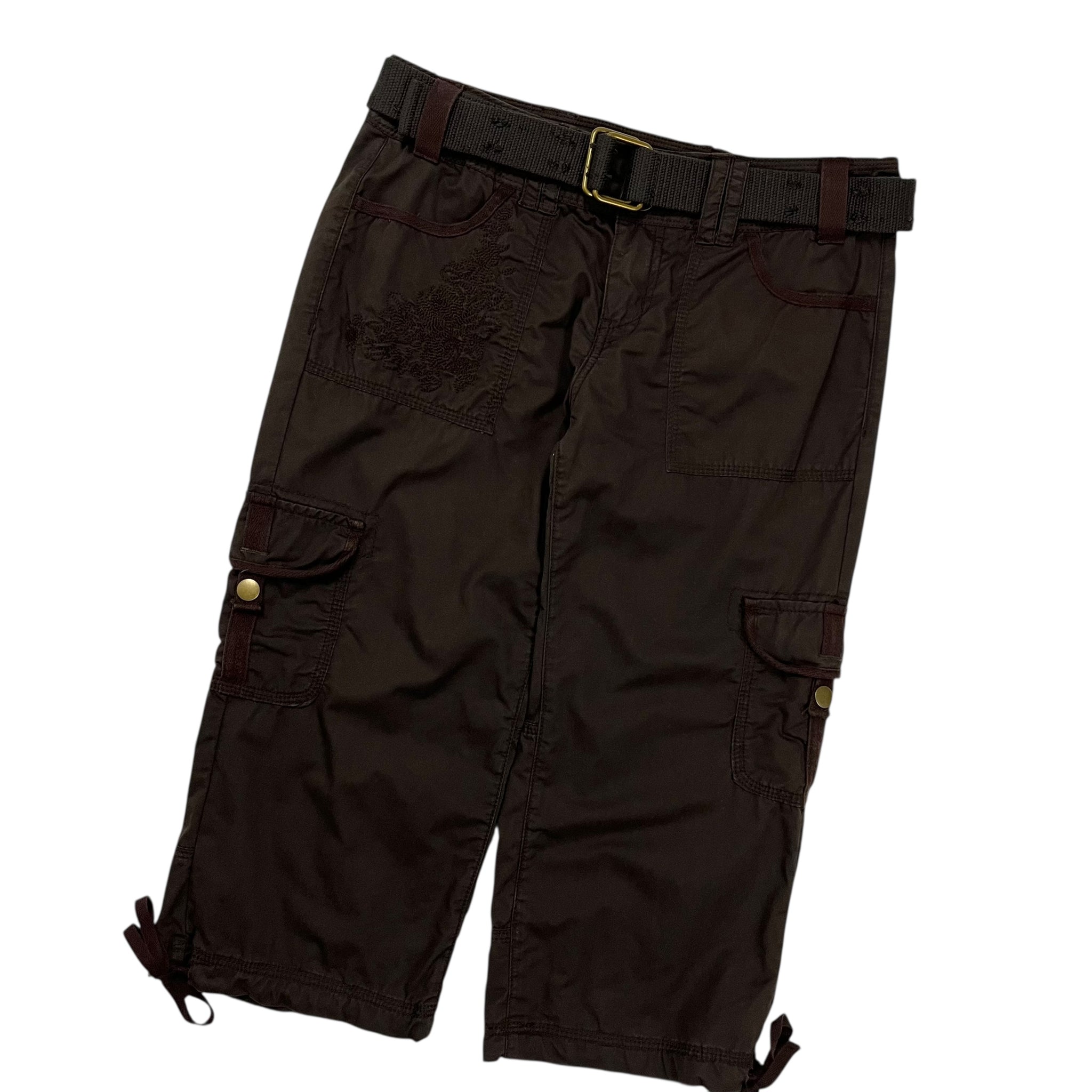 Features embroidered floral detail on pocket, multiple cargo pockets, embedded belt, and adjustable cinches at cuffs